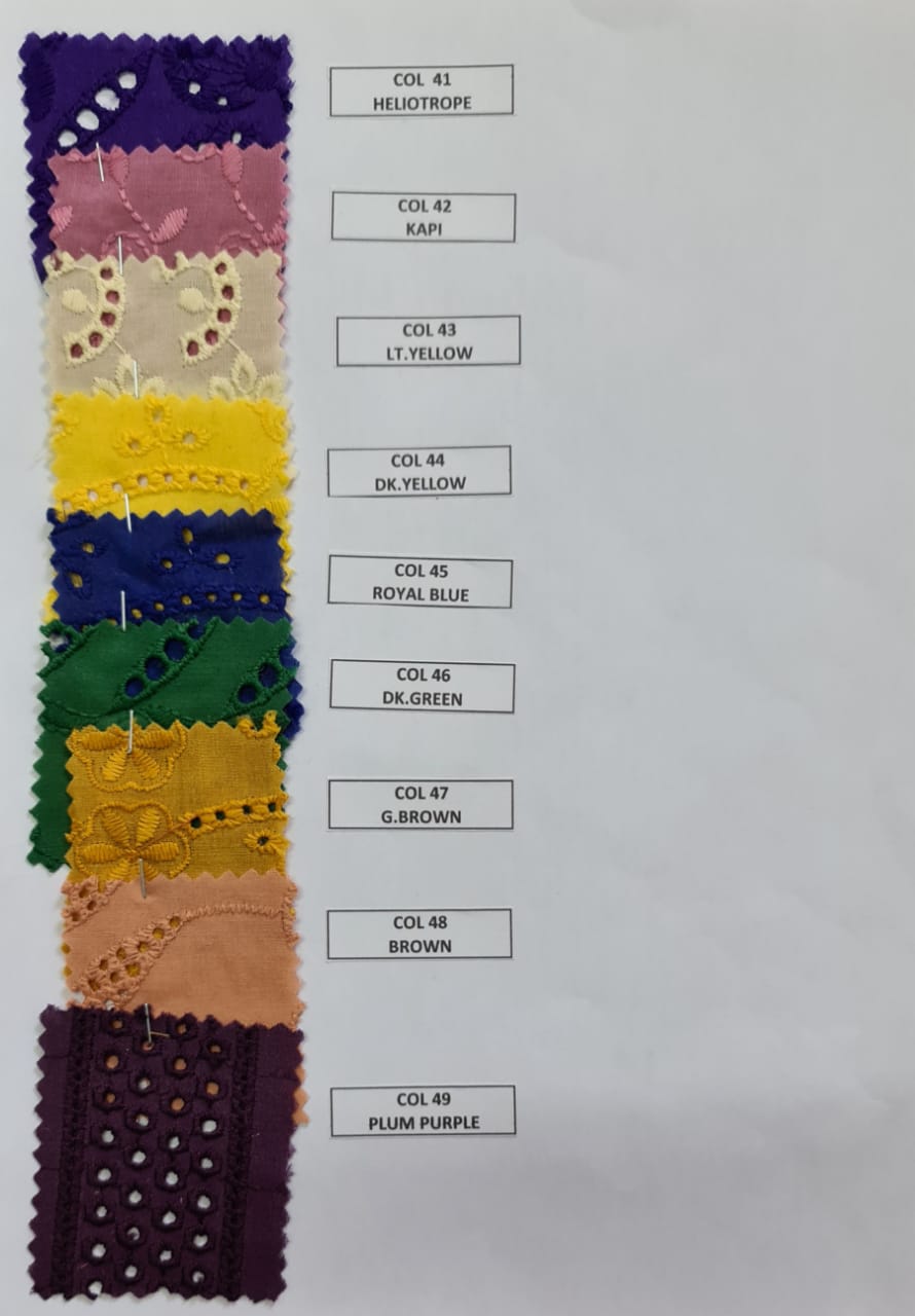 Portfolio Category: Tc Poly Cotton Embroidery With Shiny Yarn All Colour Names And Range Available Cotton Embroidery One Side Allover Tc With Embroidery Dull Yarn One Side Border Cotton Allover Tc Embroidery With Dull Yarn Tc Poly Cotton Embroidery With Shiny Yarn Trimming , Galloon Stripe Designs Two Side Border Allover Colour Names And Range Available 3